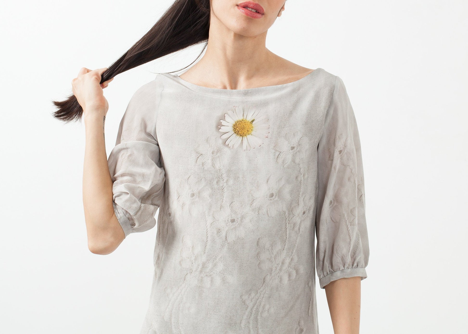 The designs of Antoni & Alison are a melange of trompe l'oeil digital imagery printed on fine silks, rendering a specified aesthetic that defines the brand and culls a dedicated clientele. The Daisy delights with its subtle textural printing and details. Flowing peasant sleeves. Wide boat neckline. Lining. Color Grey. 100% Silk. Made in the U.K. Ashley is wearing a Size 8.