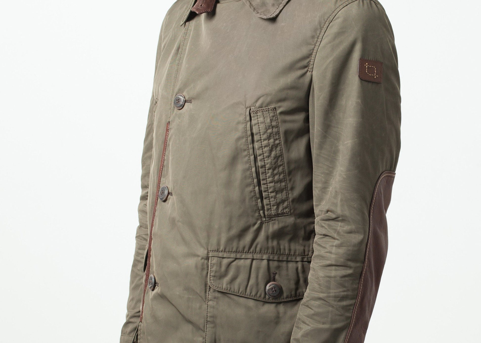 The Fraser Jacket by Handstich is an ideal layering piece for springtime breezes. Resistant against wind and rain, this piece is a classic comfort. Single button closure at center front. Stand-up or standard collar. Side angled pockets at front, front single button pockets, single interior pocket. Adjustable half back belt with snap buttons. Reinforced contrasting arm placket. Adjustable snap buttons at cuffs. Color Dark Olive. 100% Polyester, Lining 100% Cotton, 100% Polyester.