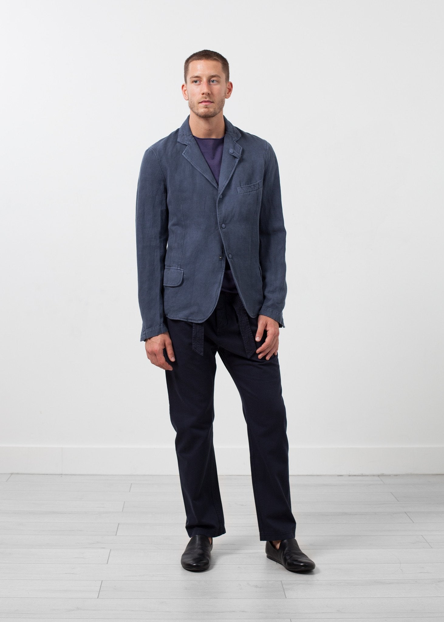 The Frimel Jacket by Hannes Roether is comfortable, lightweight, with just the right amount of casual. Snap button closure at front. Three exterior pockets, two interior pockets. Lined. Hannes Roether. Color Space. 51% Linen, 49% Cotton. Made in the EU. Matt is wearing a size Medium. Matt is 6’2”, Chest 38”, Waist 31”, Inseam 34.5”.