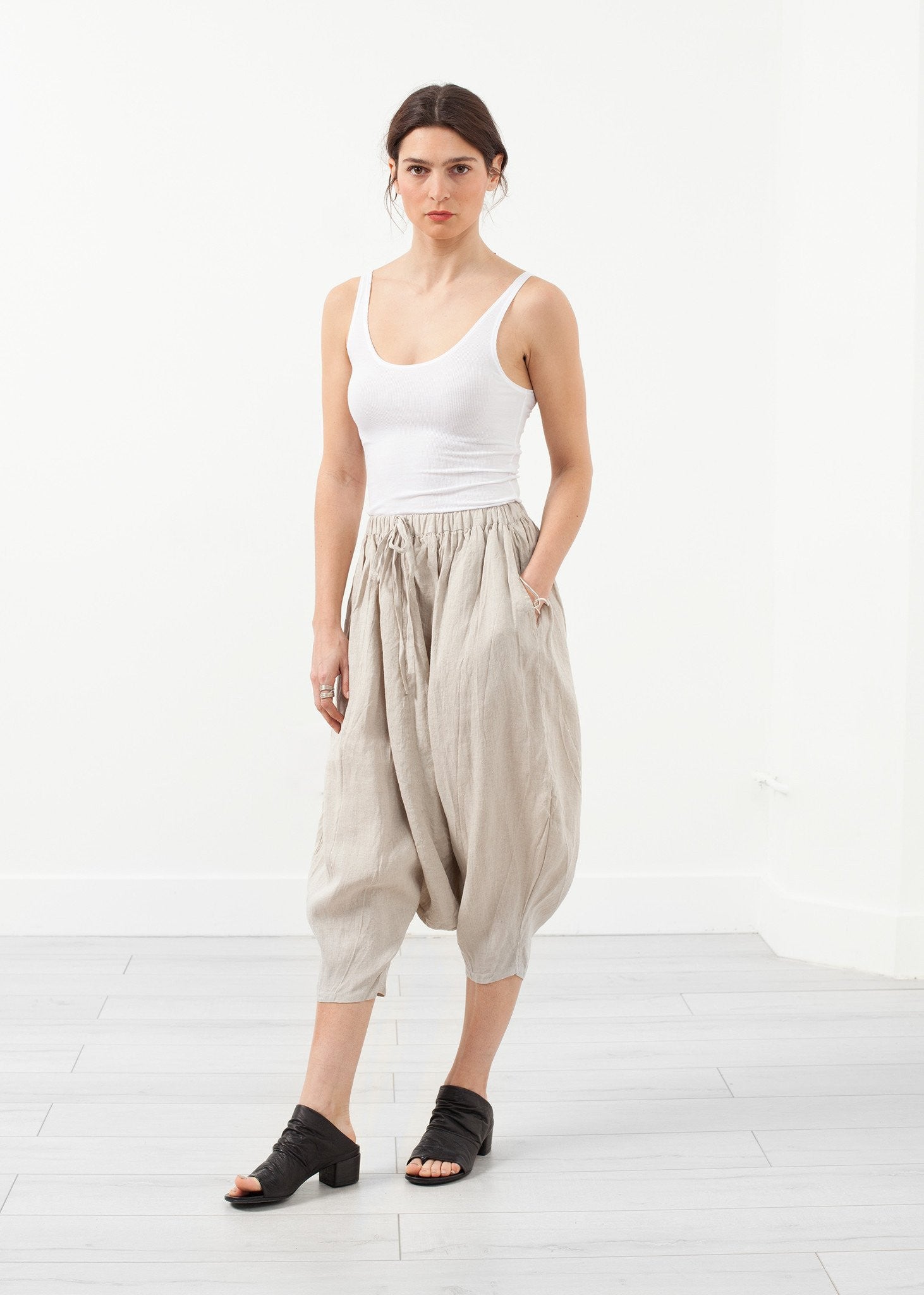 Nearly a skirt, the Heidi Pant is a comfortable luxury with its exaggerated dropped crotch. Elastic with drawstring waistband for ease. Side angled pockets at front. Ivan Grundahl. Color Natural. 100% Linen. Made in Portugal. Lana is wearing a Size 36.