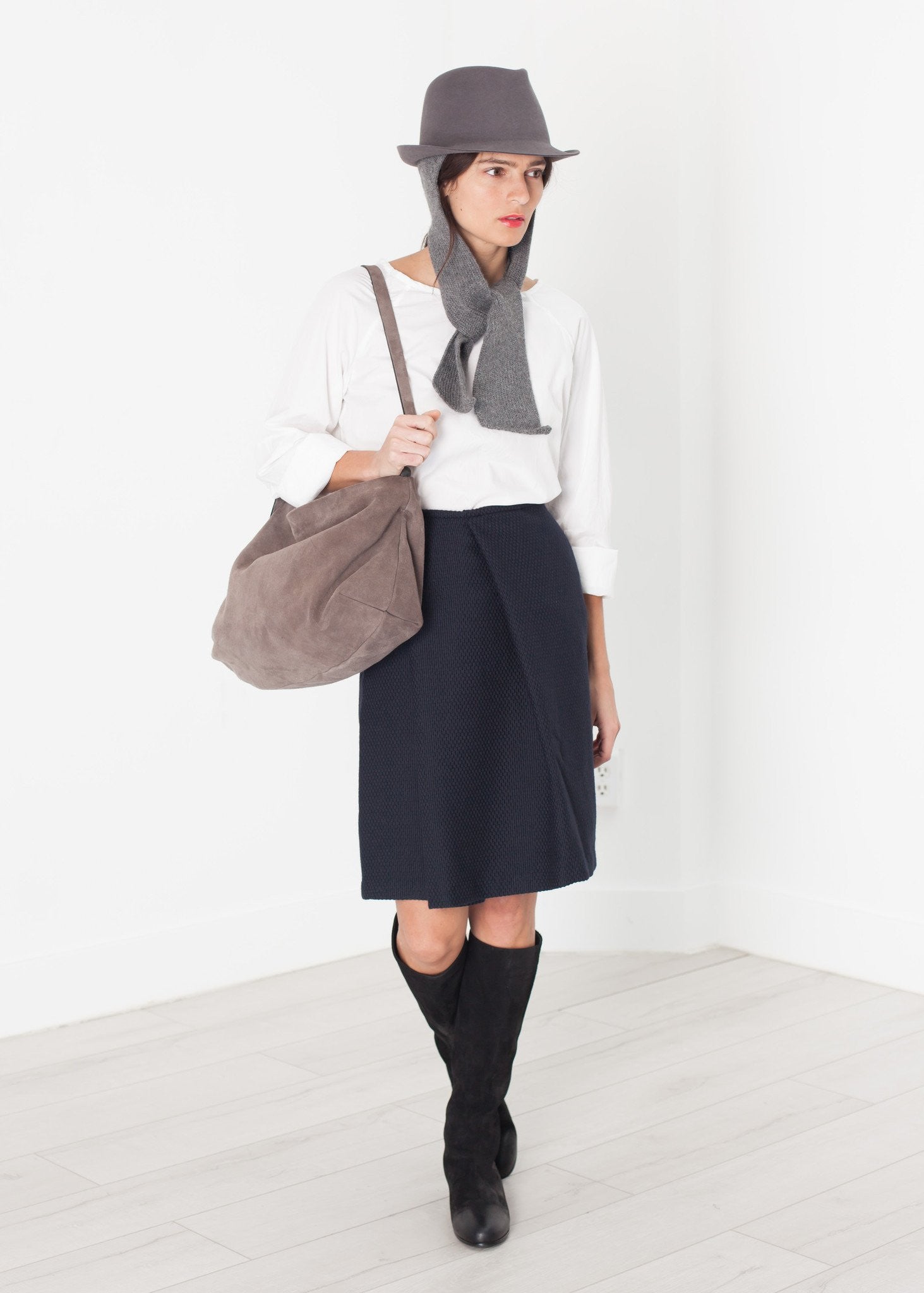 Internationally acclaimed hat designer, Fiona Bennett, offers superior-made headwear of fur felt and Alpaca wool through her new label, Kiss by Fiona Bennett. Sleek, classic, and comfortable, her pieces are crafted to age well while offering relevant statements. The Kate Hat with attached scarf gives the two in one. Color Steel Grey. 100% Fur Felt, 100% Alpaca Wool. Made in Berlin.