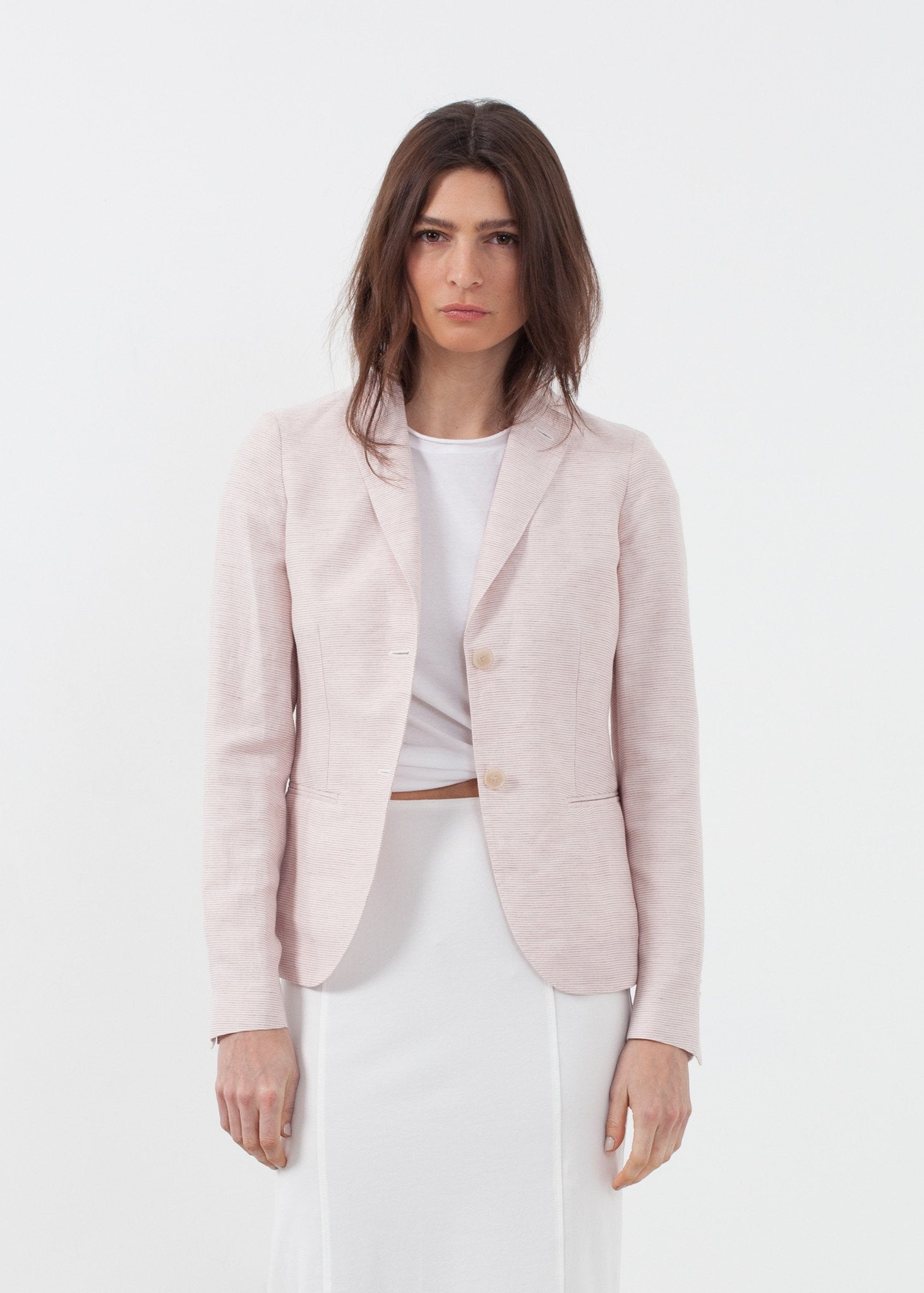 The Lavanda Blazer is an excellent springtime basic with its trim silhouette and soft color scheme. Two button placket closure at front. Two exterior pockets at front. Lining. Lardini. Color Pink. 38% Flax, 32% Viscose, 30% Cotton, Lining 70% Acetate, 30% P.B. Elite. Made in Italy. Lana is wearing the Italian 38.
