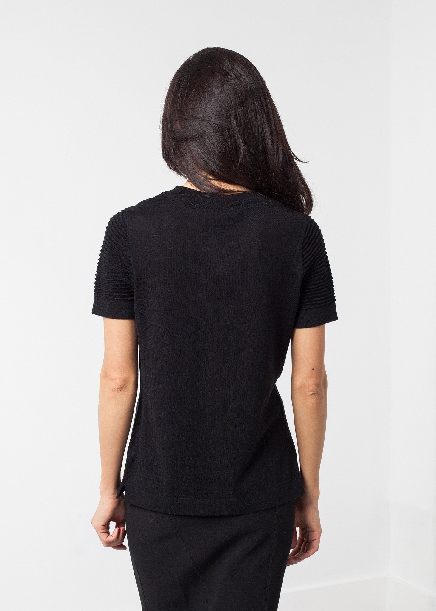 Knit rib sleeves add some much needed texture to the classic black top. Simplicity is never boring, and adds a classy edge. Crew neckline. Co. Color Black. 100% Cotton. Ashley is wearing a Small.